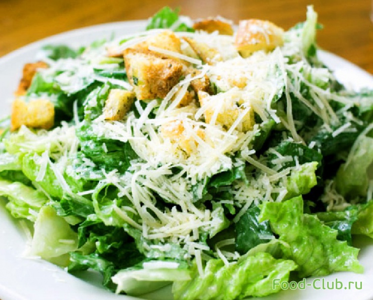 6. А вот сейчас уже можно добавить тертый пармезан и придется еще разочек перемешать. Разложить салат по тарелочкам, посыпать сверху сухариками (кстати, правильно они называются крутонами). А еще можно украсить салат тонкими ломтиками сыра пармезана.