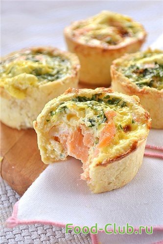 В формочки на тесто выложите кусочки рыбы и залейте приготовленной массой. Поставьте формочки в духовку при температуре 170 градусов на 15-20 минут. Тартолетки готовы, подавайте на стол.