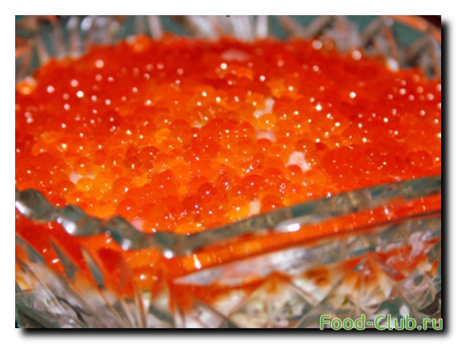 Заправляем все вместе майонезом и тщательно перемешиваем. Теперь разравниваем салат, а сверху слоем выкладываем красную икру.