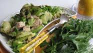 2. Мелко нарежьте филе, яйца и крабовые палочки (4 палочки оставьте для украшения блюда). Смешайте все ингредиенты, посолите и заправьте майонезом.