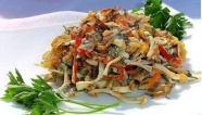 5. Поставьте салат в холодильник для пропитки на пару часов. Перед подачей на стол осторожно снимите кольцо. Приятного аппетита.