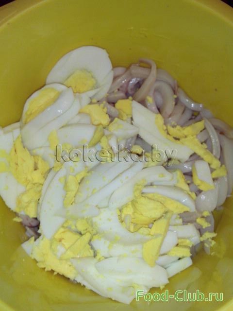 5. Добавляем измельченные яйца к кальмарам.