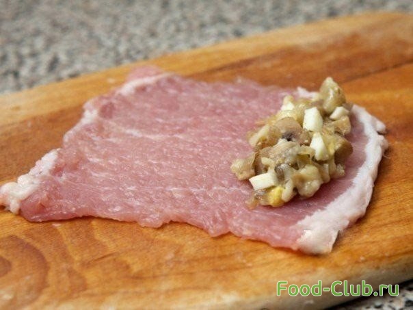 Свинину нарежьте на ровные кусочки толщиной около 1 см. Каждый кусочек посолите и поперчите со всех сторон, а потом аккуратно отбейте так, чтобы кусочки были достаточно тоненькими и большими для сворачивания.
