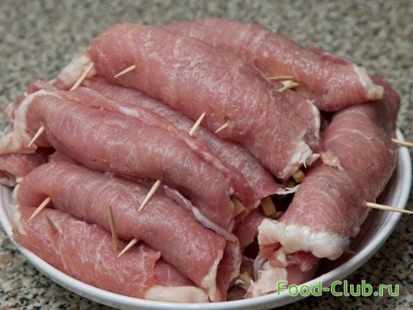 2. Заверните мясо в рулетик, а потом зафиксируйте при помощи зубочисток. Проделайте тоже самое со всеми кусочками мяса.
