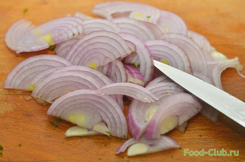 7. Лук чистим и нарезаем полукольцами.