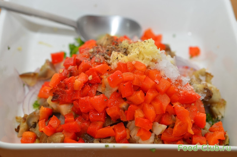8. Перец, баклажаны измельчаем на небольшие кубики, перекладываем овощи и зелень в тарелку, выдавливаем туда чеснок. Солим и перчим по вкусу, заправляем уксусом и маслом, хорошо перемешиваем и на время оставляем в сторону.