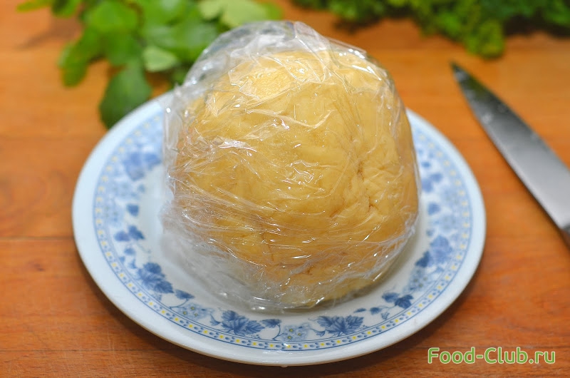4. Замешиваем тесто, скатываем в шар, оборачиваем в пищевую пленку и ставим в холодильник на 30 минут.