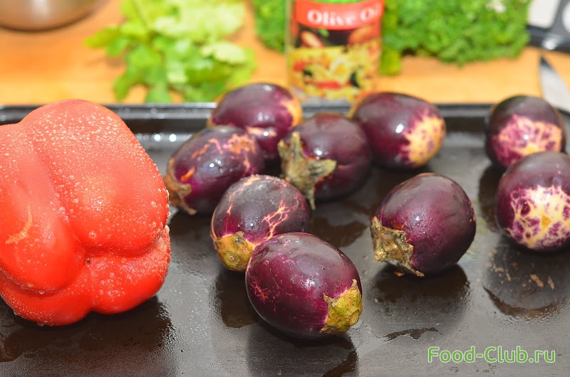 1. Перцы и баклажаны моем и обсушиваем бумажным полотенцем. Накалываем кожицу овощей по периметру, чтобы она не лопнула при запекании и ставим в предварительно разогретую духовку на 25-30 минут, до полной готовности овощей.