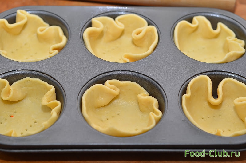 9. Достаем тесто, тонко раскатываем, нарезаем кружки на пару см больше диаметра формочек. Формочки смазываем маслом, выкладываем туда тесто. Дно формочек накалываем вилкой и ставим в предварительно разогретую духовку на 10 минут, чтобы подсушится.