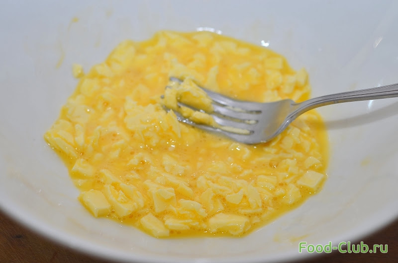 2. В это время занимаемся тестом, для этого перемешиваем яйцо и масло, но не до однородности, как показано на фото. Для этого нарезаем масло кубиками, а затем слегка мнем их вилкой. Добавляем очень холодную воду.