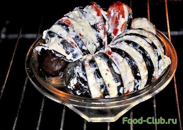 2. .Разогрейте духовку. Смажьте форму для запекания маслом, выложите в нее баклажан и слегка раскройте надрезы. Смажьте надрезы в баклажане растительным маслом, а потом вложите туда немного пасты из брынзы и кусочек помидора. Сверху можно присыпать тертым сыром пармезан…