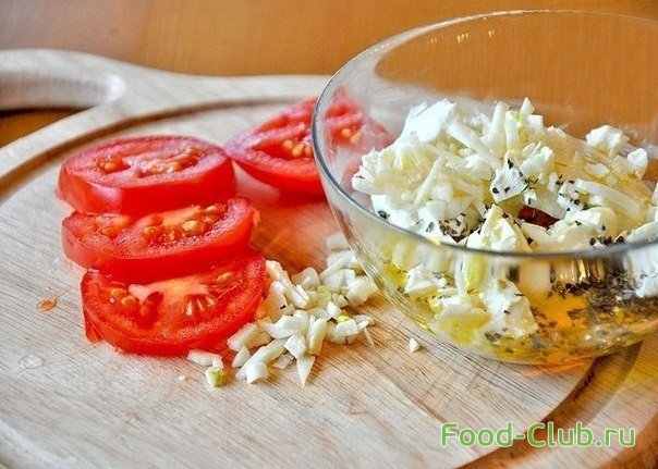 Помидоры нарежьте на тоненькие кружочки или полукольца (смотря какого размера баклажан, кружочек помидорки должен помешаться в прорези на баклажане).