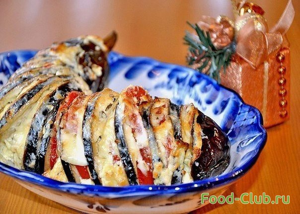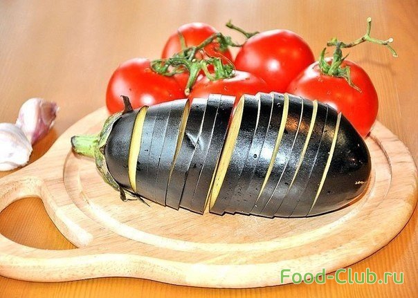 1. Для начала порежьте баклажан га кусочки, не доходя до края, чтобы получилась гармошка. Положите баклажан в соленую воду на пару часов (это необходимо для того, чтобы с баклажана ушла вся горечь).