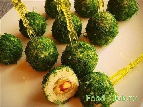 5. Укроп промойте, очень хорошо обсушите и мелко порежьте. Обкатываем сырные шарики в укропе. Закуска готова, можно подавать к столу.