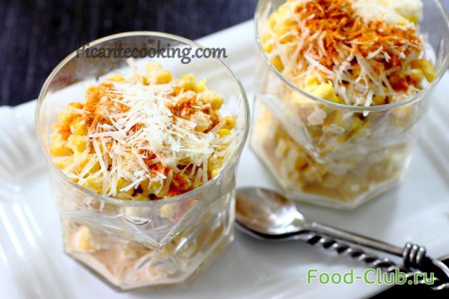 4. Раскладываем кукурузу по сервировочным стаканам, поверх посыпаем тертым сыром и молотым перцем. Удивительное мексиканское блюдо готово, можно подавать к столу! Приятного аппетита!