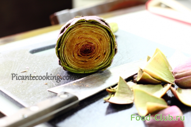 1. Артишоки чистим и срезаем у каждого верхушку чуть ниже середины. Удаляем два слоя внешних листьев.