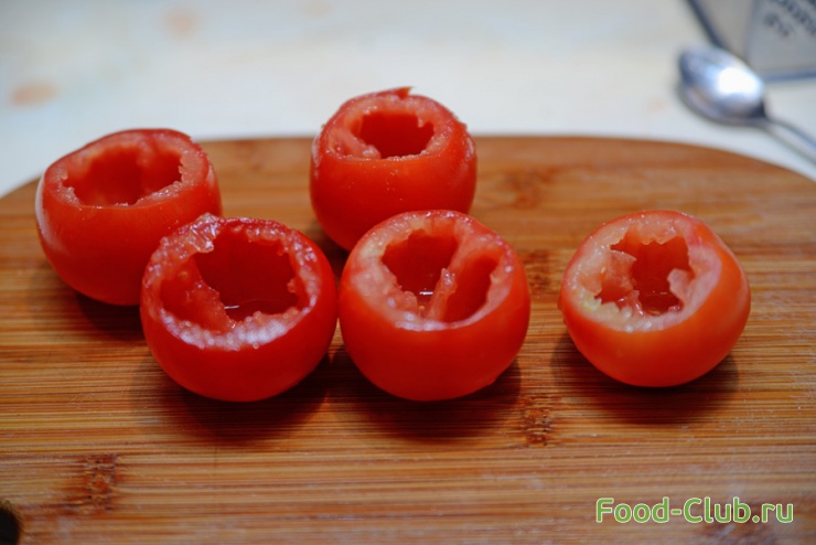 1. У помидор отрежьте шапочку и вытащите мякоть.