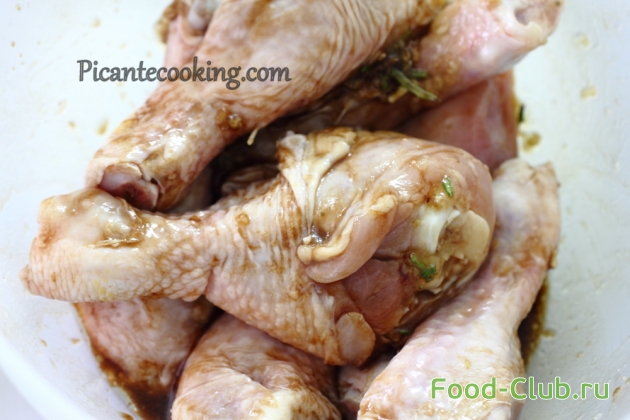 1. Для начала смешайте ингредиенты для маринада (чеснок пропустите через пресс). Опустите куриные ножки в миску с маринадом и хорошенько перемешайте так, чтобы каждый кусочек мяса был покрыт смесью пряностей. Прикройте миску пищевой пленкой и уберите в холодильник часов на 8.