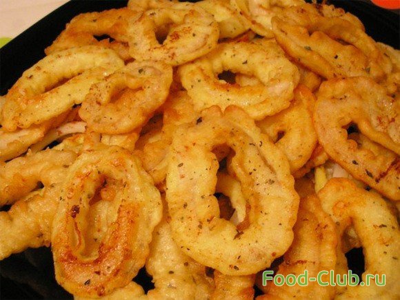 5. Пока кальмары будут жариться, подготовьте блюдо и накройте его бумажным полотенцем. Готовые кальмары выкладывайте на блюдо с полотенцами, а когда весь жир впитается- переложите кальмары на другую тарелку.