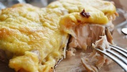 5. Теперь собираем блюдо: уложите картошку в форму для запекания, посолите и поперчите, обрызните растительным маслом. Сверху выложите кусочки рыбы, немного посолите. Теперь на рыбу выложите зажарку, а потом аккуратно выложите чесночный соус.