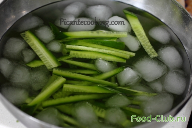 3. Готовим ингредиенты для начинки, огурцы и морковь нарезаем соломкой. Огурцы перекладываем в миску с холодной водой и льдом, так они будут хрустящими. Через пару минут воду сливаем.
