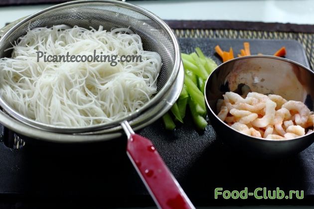 4. Лапшу замачиваем в теплой воде, когда она станет мягкой, воду сливаем. Креветки бланшируем.