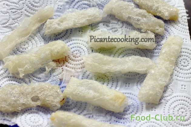 2. Разогреваем большое количество масла в сковороде wok либо в котелке и обжариваем до хруста свертки рисовой бумаги. Выкладываем их на тарелку, застеленную бумажным полотенцем, чтобы убрать излишки жира. Рисовая бумага очень клейкая, и если два свертка прикоснуться, то обязательно склеятся, поэтому действовать необходимо неторопливо и аккуратно.