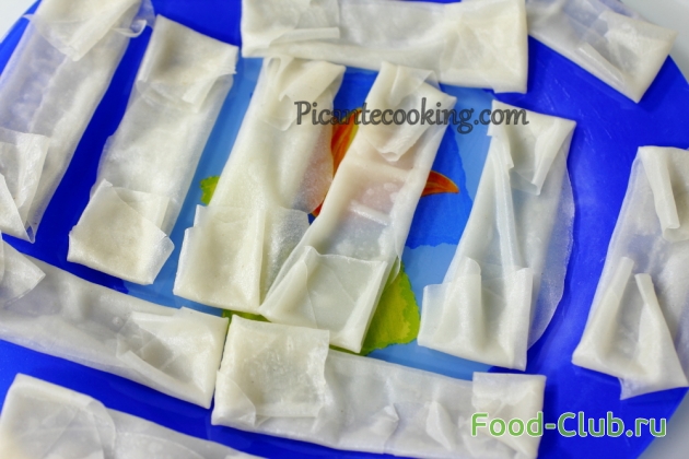 1. 10 листьев рисовой бумаги один за другим, последовательно замачиваем на несколько минут в воде комнатной температуре. Затем выкладываем на доску, сворачиваем 3 раза и закручиваем как сигару. Или другим способом, чтобы получилось прямоугольных 10 свертков, 12-14 см длиной и 2-2,5 см шириной. Выкладываем свертки на тарелку так, чтобы они не касались друг друга.