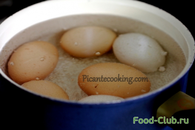 1. Яйца отвариваем, остужаем, чистим, разрезаем пополам, желтки вынимаем, белки на время оставляем в сторону.