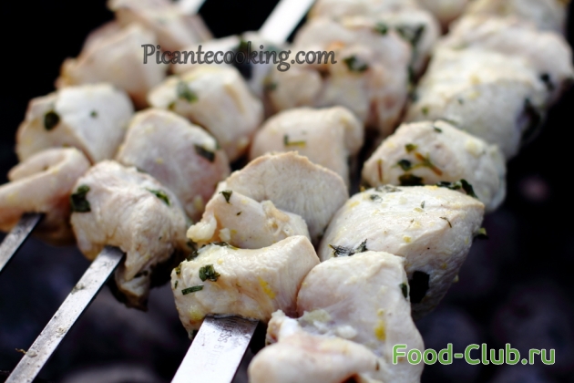 3. Когда мясо замаринуется, подготовьте огонь и нанизайте куриные кусочки на шампуры. Оставьте их еще минут на 20 при комнатной температуре. Жарьте минут 20-25 до готовности. Подавайте с любимым соусом. Приятного аппетита!