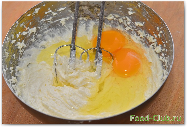 2. Добавляем яйца, вновь хорошо взбиваем массу миксером.