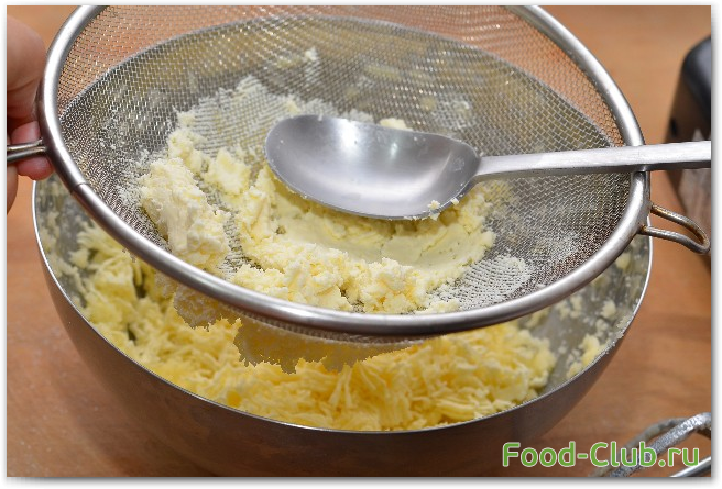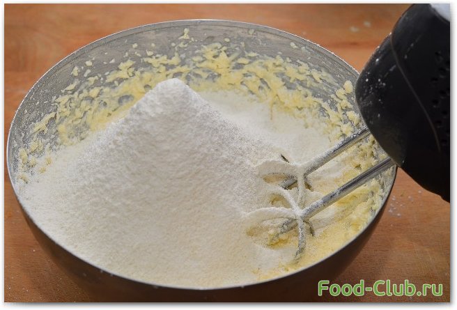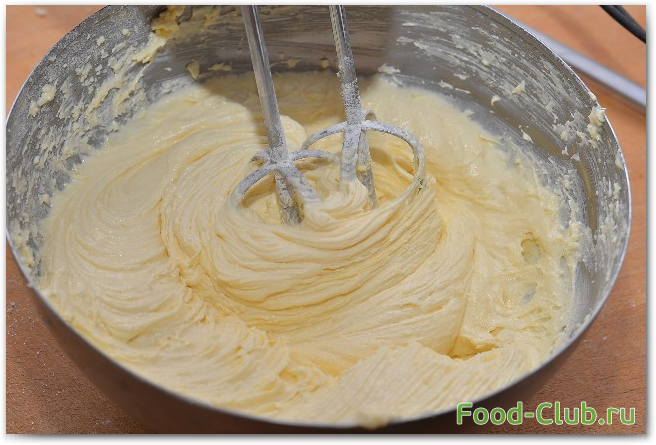 1. Взбиваем масло с сахаром до пышной массы (7-8 минут). Добавляем протертый через сито творог и взбиваем массу до однородности.