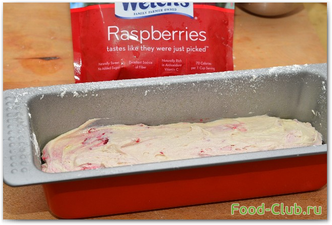 4. Перемешиваем массу до однородности, чтобы не было комочков. Аккуратно добавляем малину, и перемешиваем тесто ложкой. Лучше если ягоды будут хорошо заморожены и не успеют пустить сок.