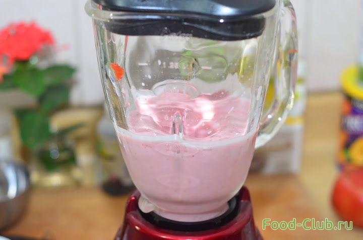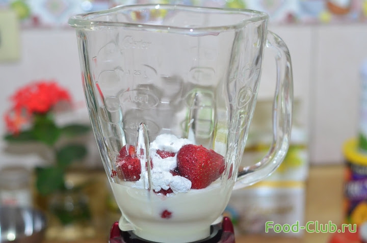 6. Пока готовится запеканка, приступаем к ягодному соусу. Для его приготовления йогурт, клубнику и сахарную пудру выкладываем в блендер.