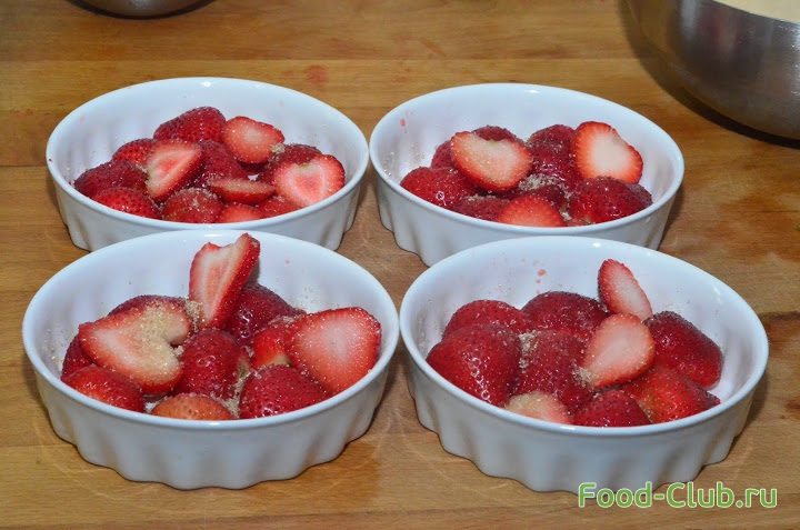4. Формочки смазываем сливочным маслом, выкладываем клубнику и слегка присыпаем их сахаром. Кто любит кислинку, сахаром может не посыпать.