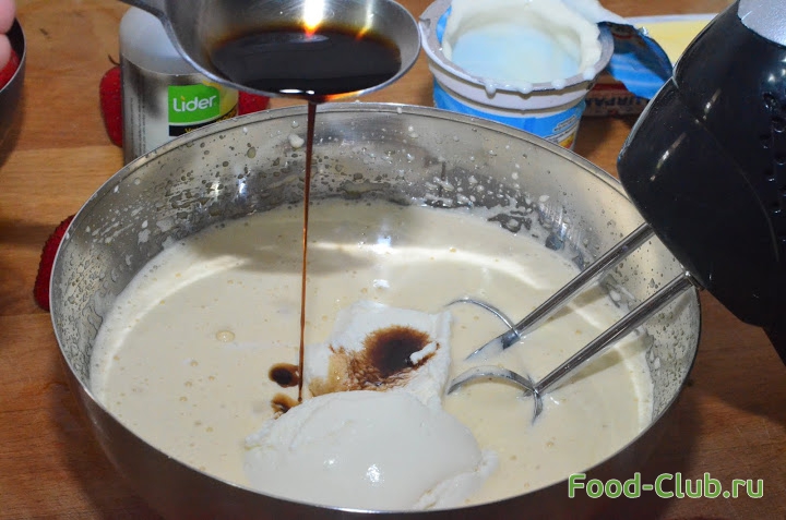 3. Добавляем творог, йогурт и ванильную эссенцию, взбиваем до однородности.