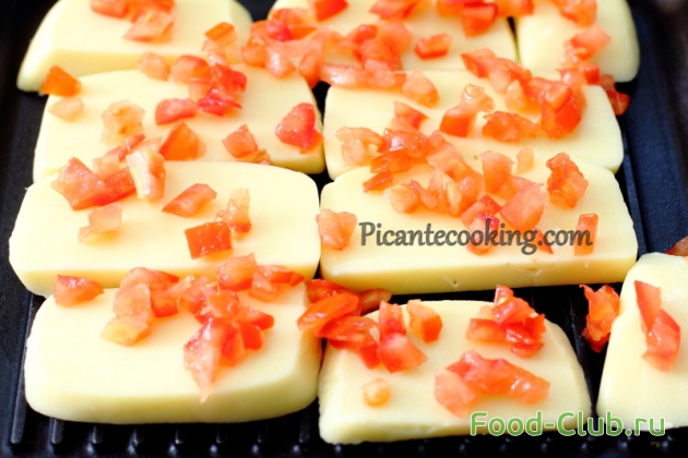 2. Нарежьте сыр на пластины и выложите в форму для запекания или чугунную сковородку. Посыпьте сыр кубиками помидора и поставьте форму в духовку.