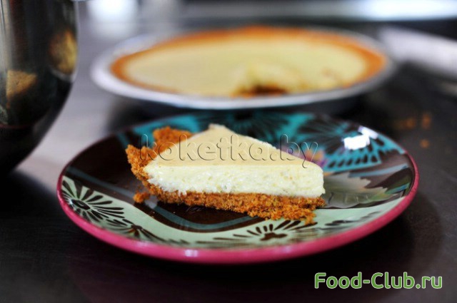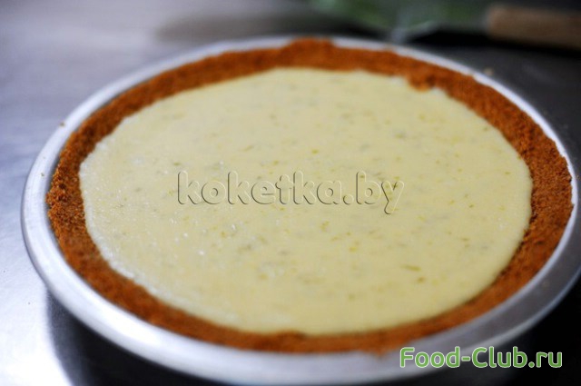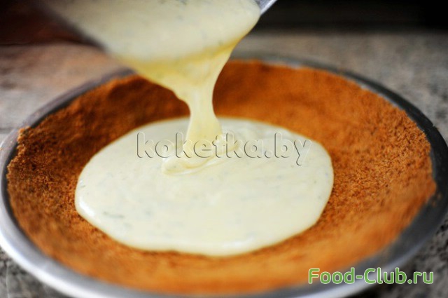 4. Выливаем начинку на готовый подстывший корж и выпекаем еще 15 минут до румяности.