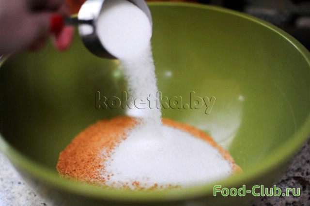 1. Ставим разогреваться духовку, и приступаем к приготовлению коржа, для этого в кухонном комбайне или толкушкой разминаем печенье. Перемешиваем печенье с сахаром и растопленным сливочным маслом.