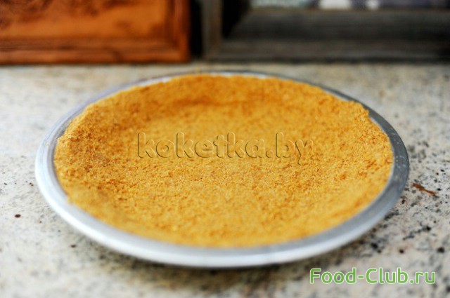 2. Получившуюся массу выкладываем на противень, формируем корж и отправляем в духовку на 5 минут. Ставим готовый корж остывать.