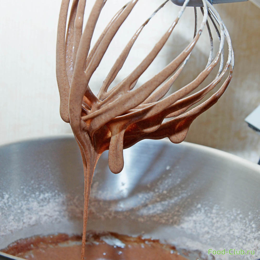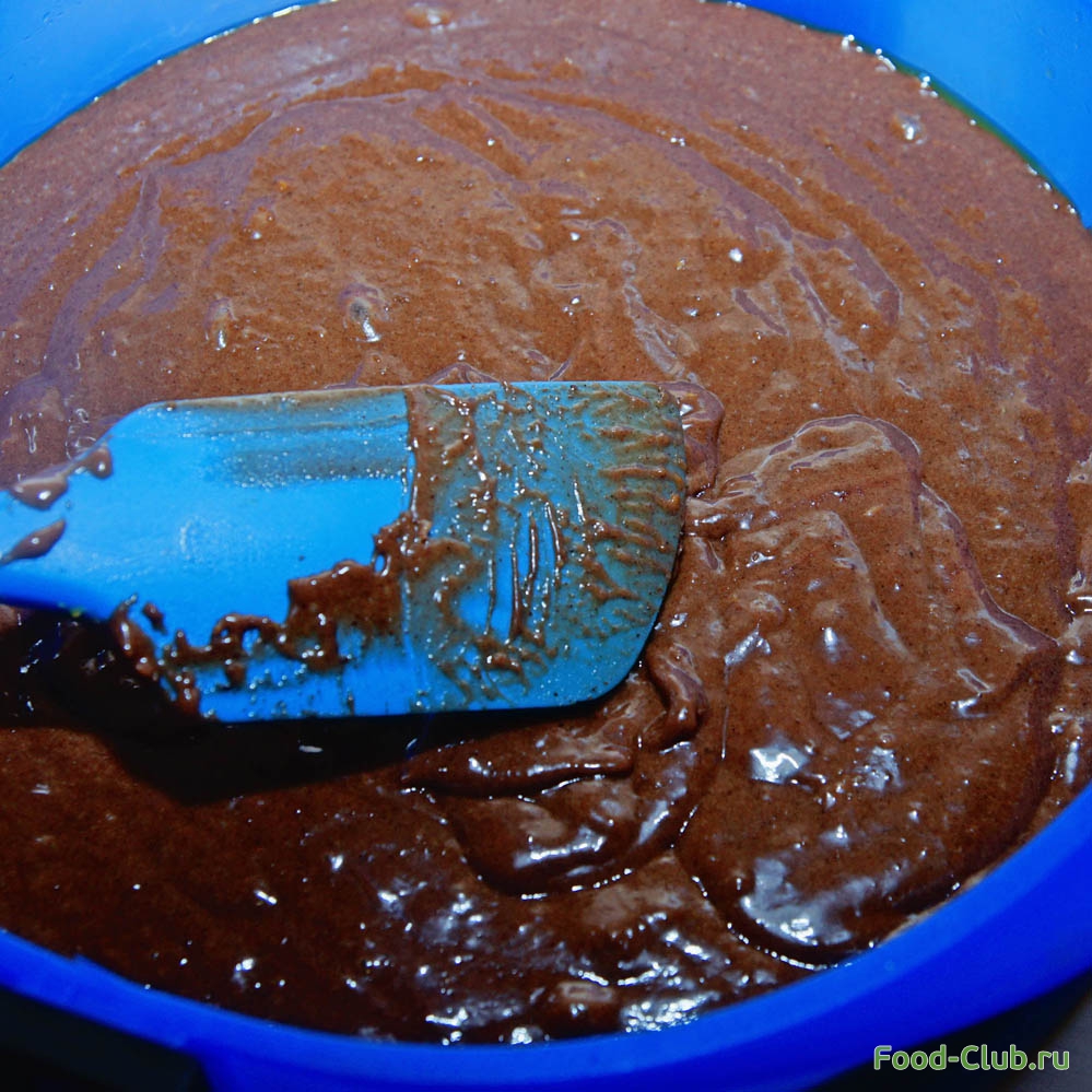 6. Соедините шоколадную и яичную смесь до однородной консистенции. Выложите в форму для торта, выровняйте верхушку.
