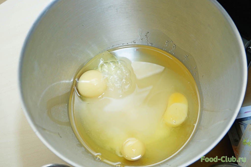 2. Яйца взбейте с сахаром и оливковым маслом.