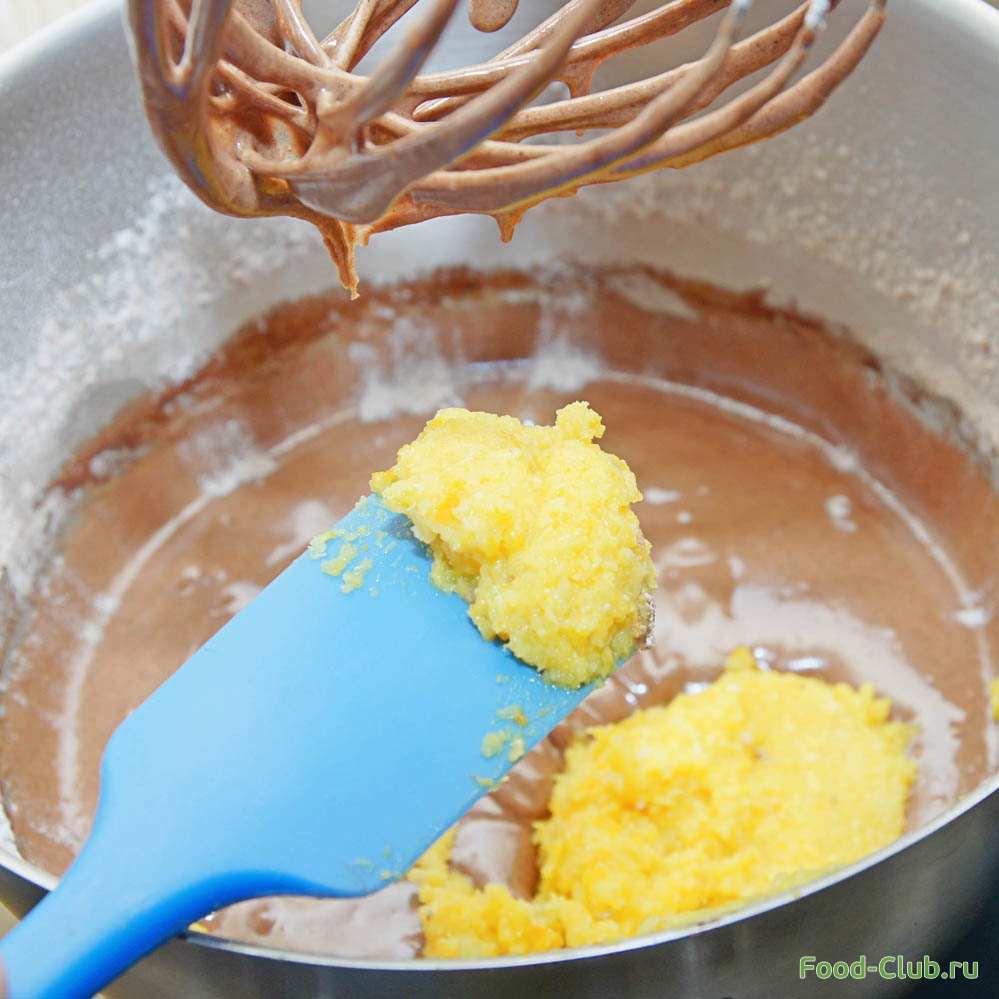 3. В полученную смесь просейте муку, разрыхлитель и какао порошок и перемешайте до однородной массы.