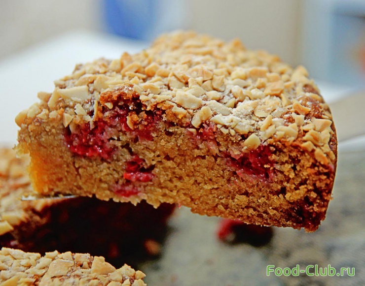 3. Выложите половину теста в форму для торта, сверху выложите малину и залейте оставшимся тестом. Сверху покидайте лепестки миндаля (или мелко порезанный миндаль).
