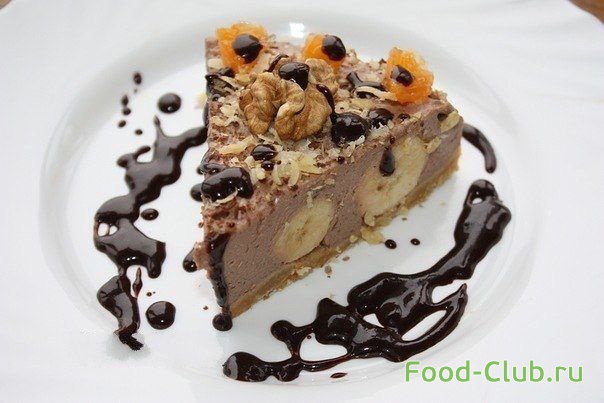 Бананы очистить и выложить на нашу ранее приготовленную основу. Залейте бананы шоколадным суфле и поставьте в холодильник на ночь.Утром выложите десерт на блюдо и украсьте по желанию. Приятного чаепития!