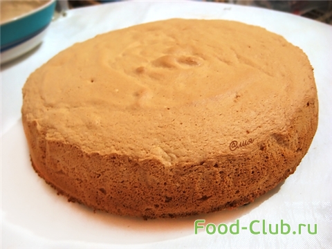 2. Сначала готовим бисквит. Отделите белки от желтков. В желтки добавьте 3 ложки сахара и уберите в сторону. В белки добавьте остальной сахар и взбейте до крепких пиков, а затем миксером перемешайте желтки и сахар, пока не получится светлая и пышная смесь. Добавьте желтки в белки и перемешайте. Разогрейте духовку. Форму ( у меня 24 см) выстелите бумагой для выпечки и аккуратно перелейте в нее тесто. Разровняйте и поставьте в духовку. Проверяйте готовность спичкой, если при проколе бисквита она сухая, то бисквит готов. Остудите бисквит в форме. а затем аккуратно достаньте.