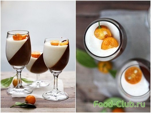 Приготовьте апельсиновую панна – котту. Растворите желатин в 25 мл молока на водяной бане. Сливки, сахар, оставшееся молоко доведите до кипения на малом огне. Снимите массу с огня и влейте в желатин, добавьте конфитюр. Тщательно все перемешайте. Остудите массу до комнатной температуры и влейте поверх застывшего шоколада.