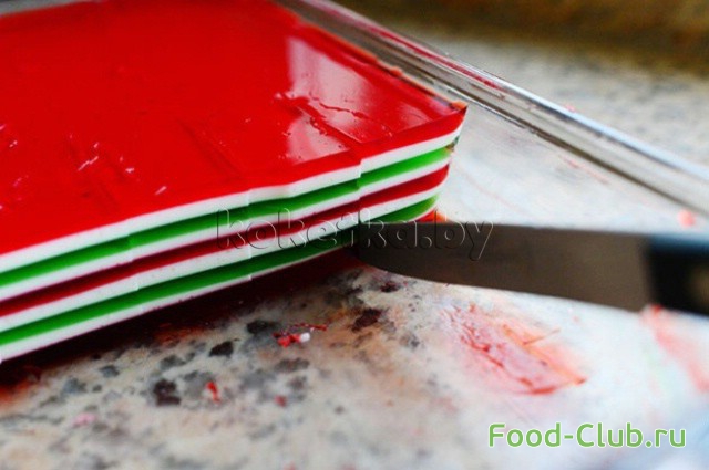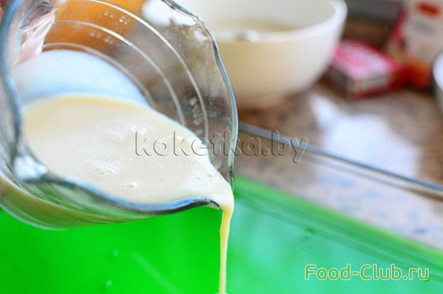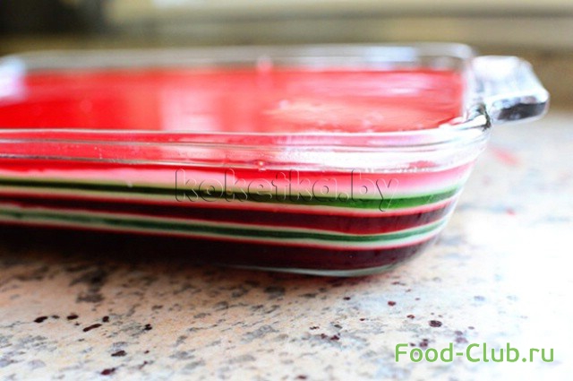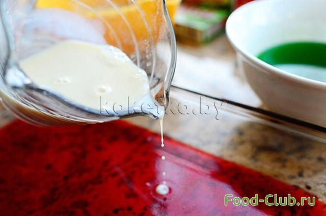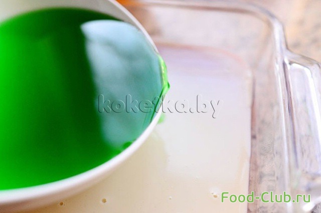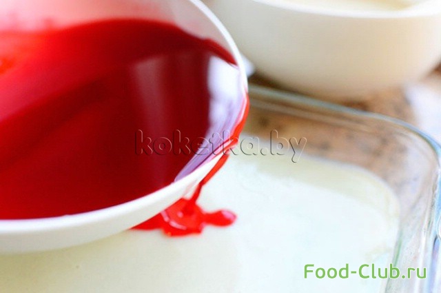 8. Заливаем молочное желе поверх застывшего красного слоя, ставим форму в холодильник до полного застывания желе.