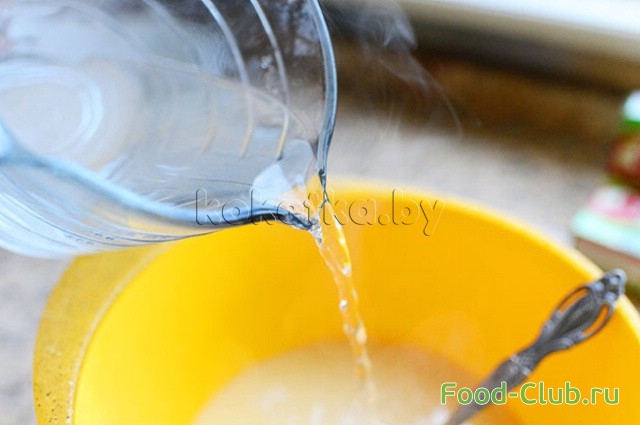 5. Когда слой застыл, начинаем готовить молочное желе. Для этого желатин заливаем кипятком.