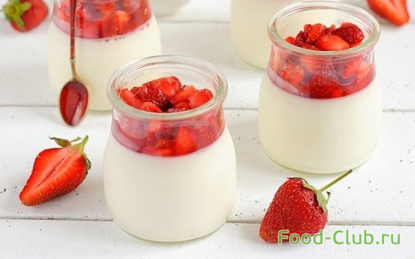 6. Когда желе застынет, достаньте формочки из холодильника, на несколько секунд опустите в горячую воду, выньте панна-котту и украсьте клубничным соусом.Наслаждайтесь!